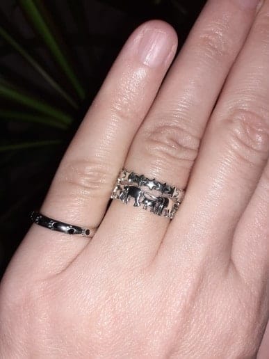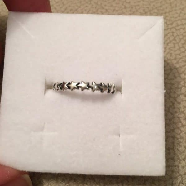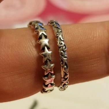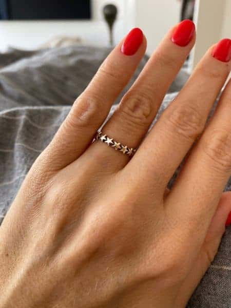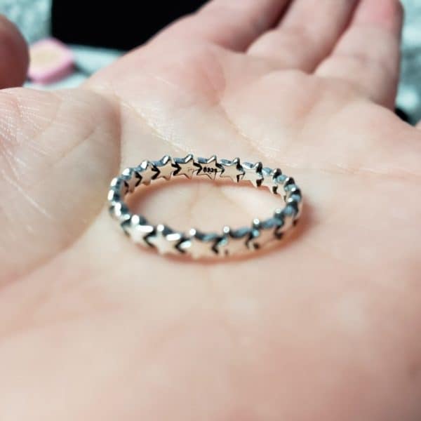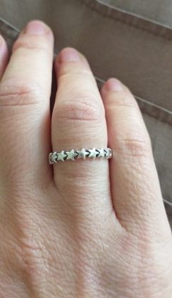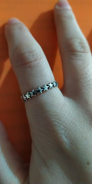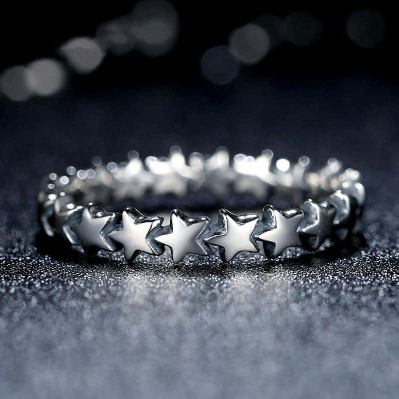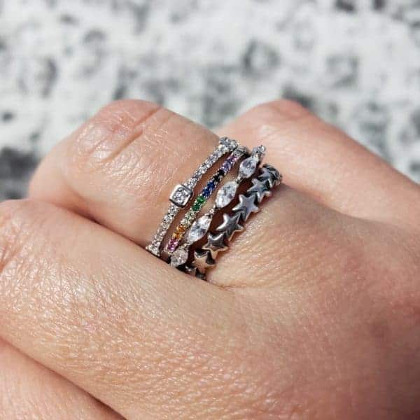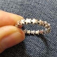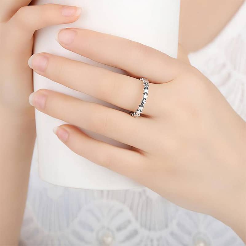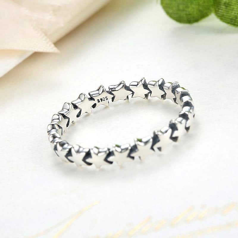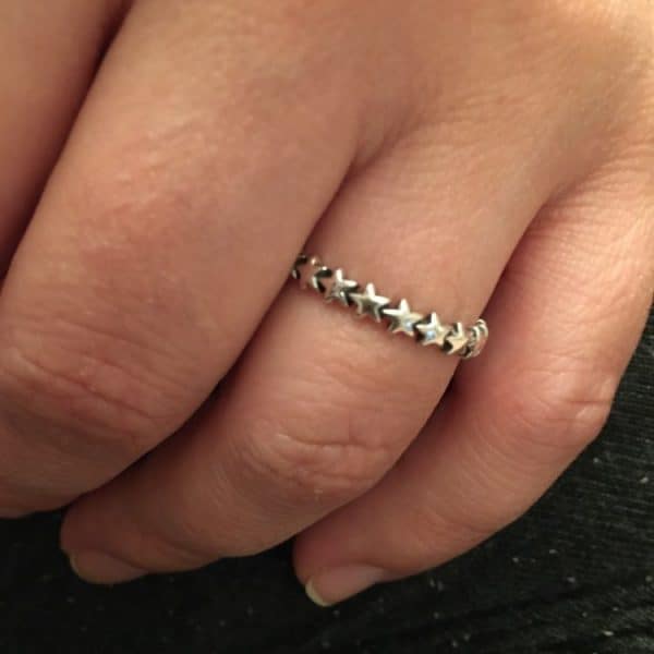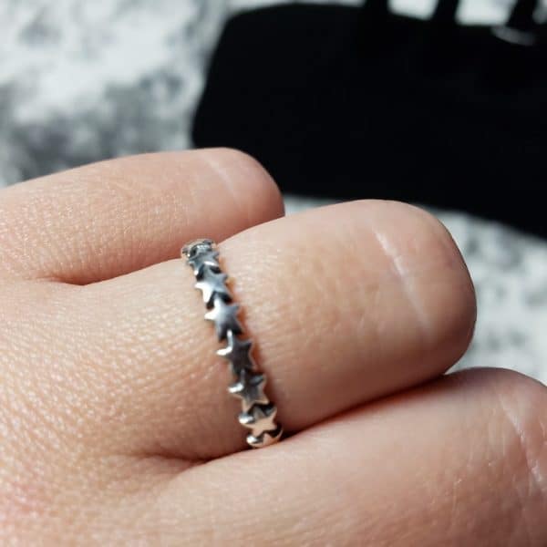 Trendy example of thin silver rings and in particular, a star-studded beauty that you can combine with other stackable rings.